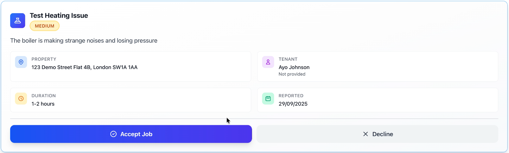 Tenant reports a boiler issue → AI identifies as urgent → notifies approved heating vendor → booking secured in 15 minutes.